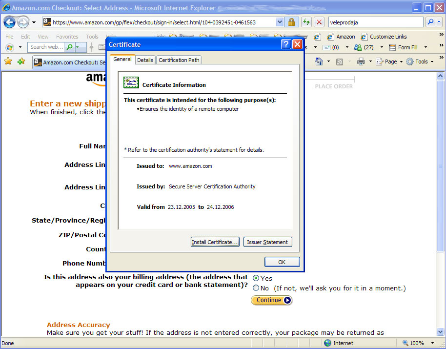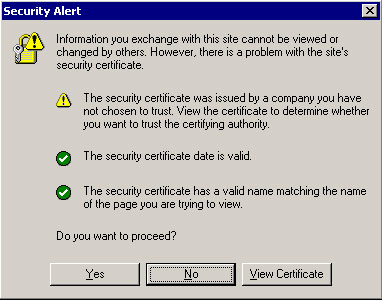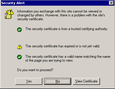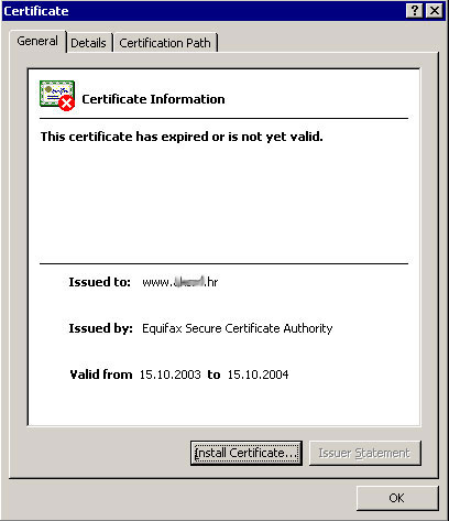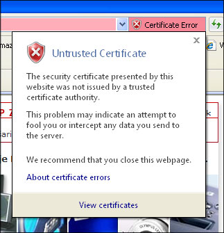 Ukoliko bilo koji od tri ranije spomenuta parametra certifikata nije ispravan, vaš web browser će vas obavijestiti o tome i prepustiti vama da se odlučite za daljnje akcije. Nekoliko slijedećih ilustracija će vam pomoći kako da identificirate takve slučajeve u raznim browserima.Microsoft Internet Explorer 7