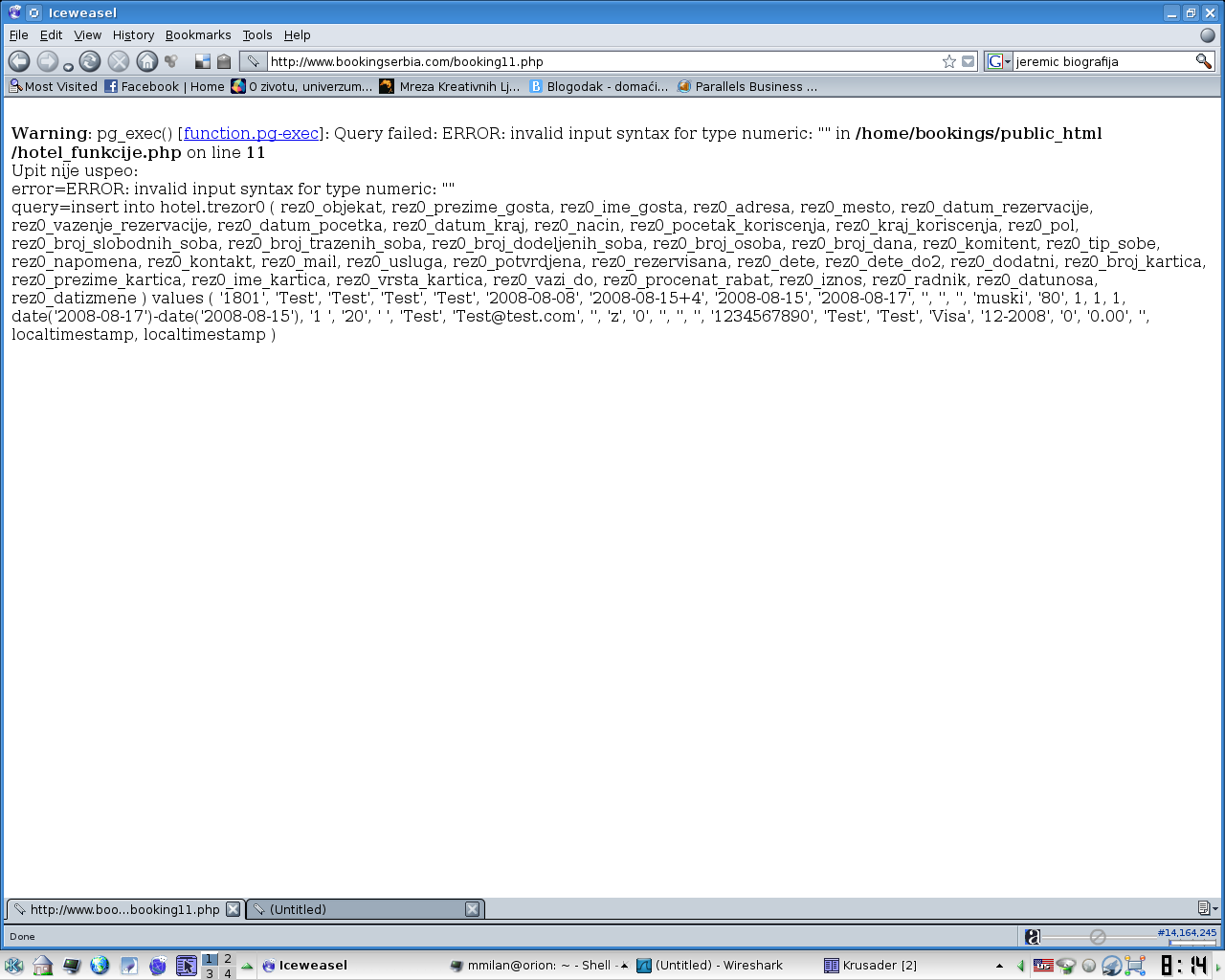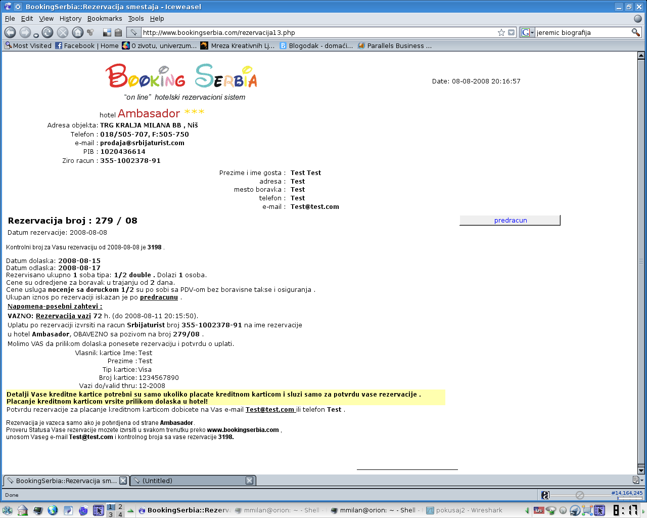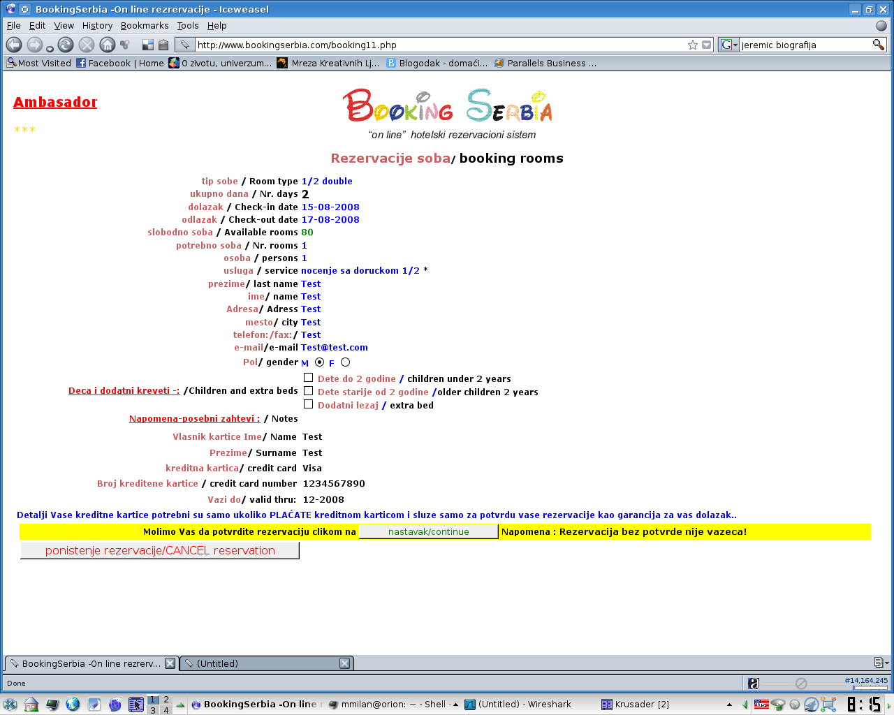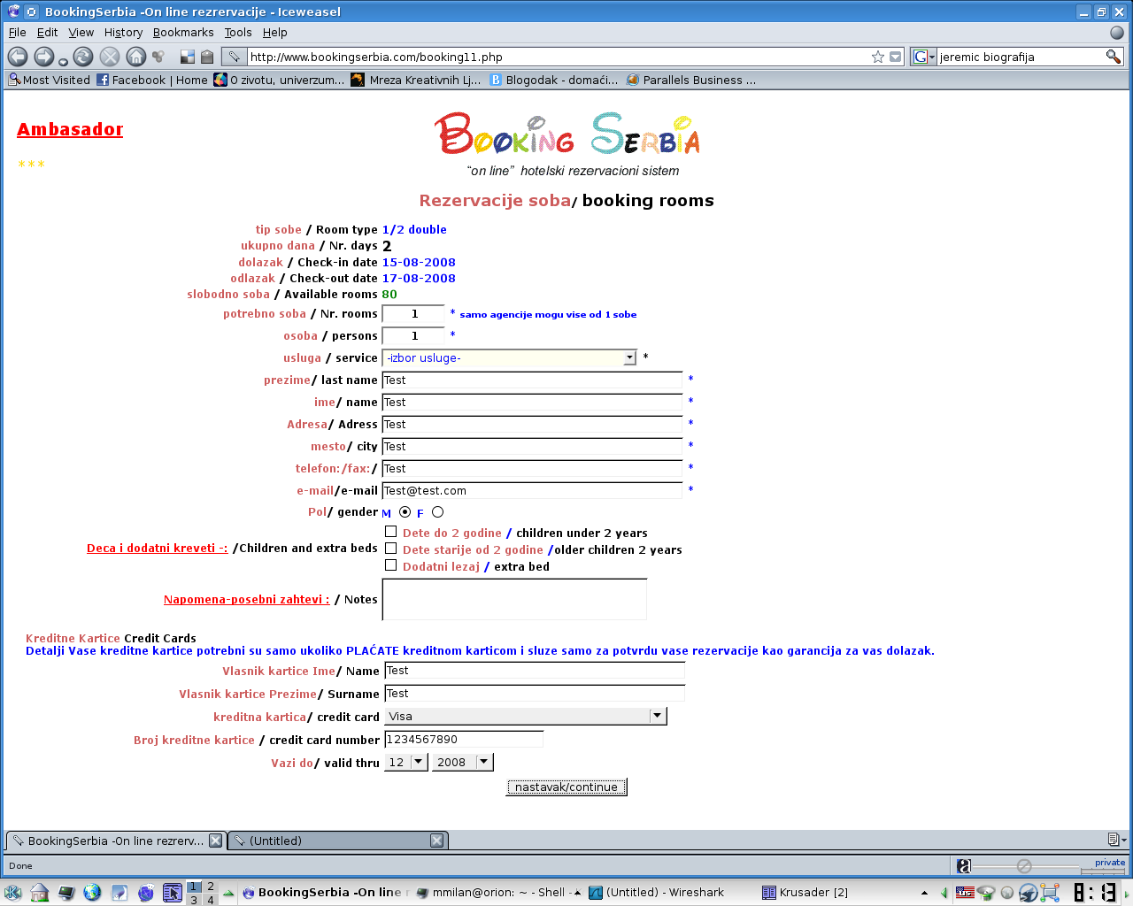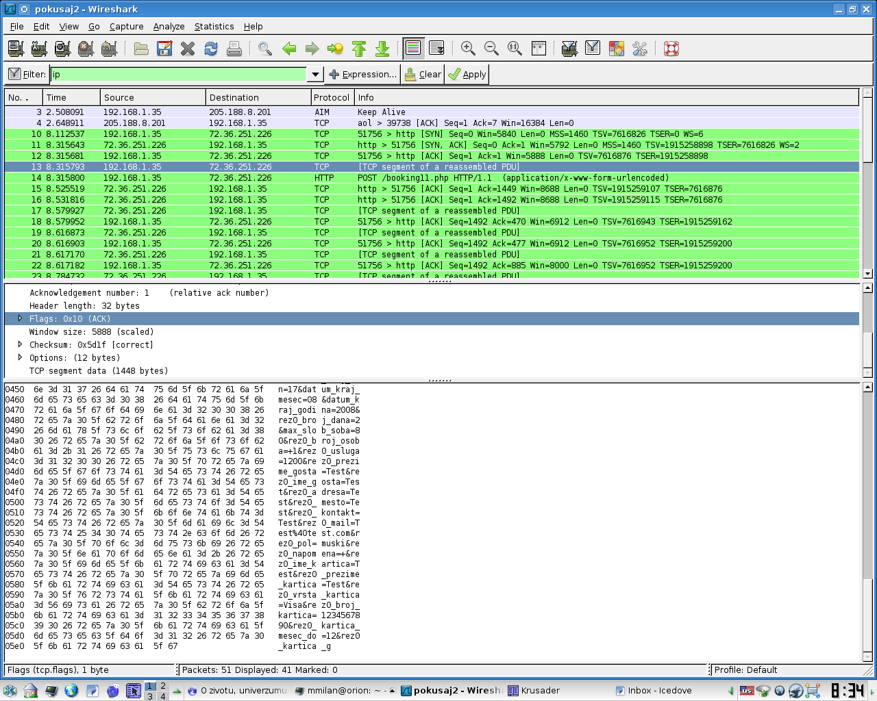 Wireshark, lep programcic za analizu saobracaja na mrezi, ovog puta je posluizo za proveru moje pretpostavke. U ovom slucaju rec je o simuliranoj situaciji, podaci nisu tacni radim na mojoj lokalnoj mrezi – ali na isti nacin neko moze da presretne podatke i prilikom pravog pokusaja rezervacije. Broj kreditne kartice i svi podaci lako mogu da padnu u pogresne ruke!